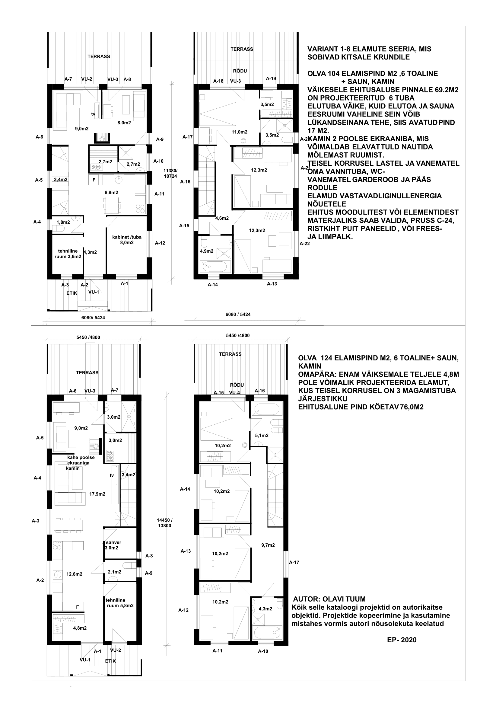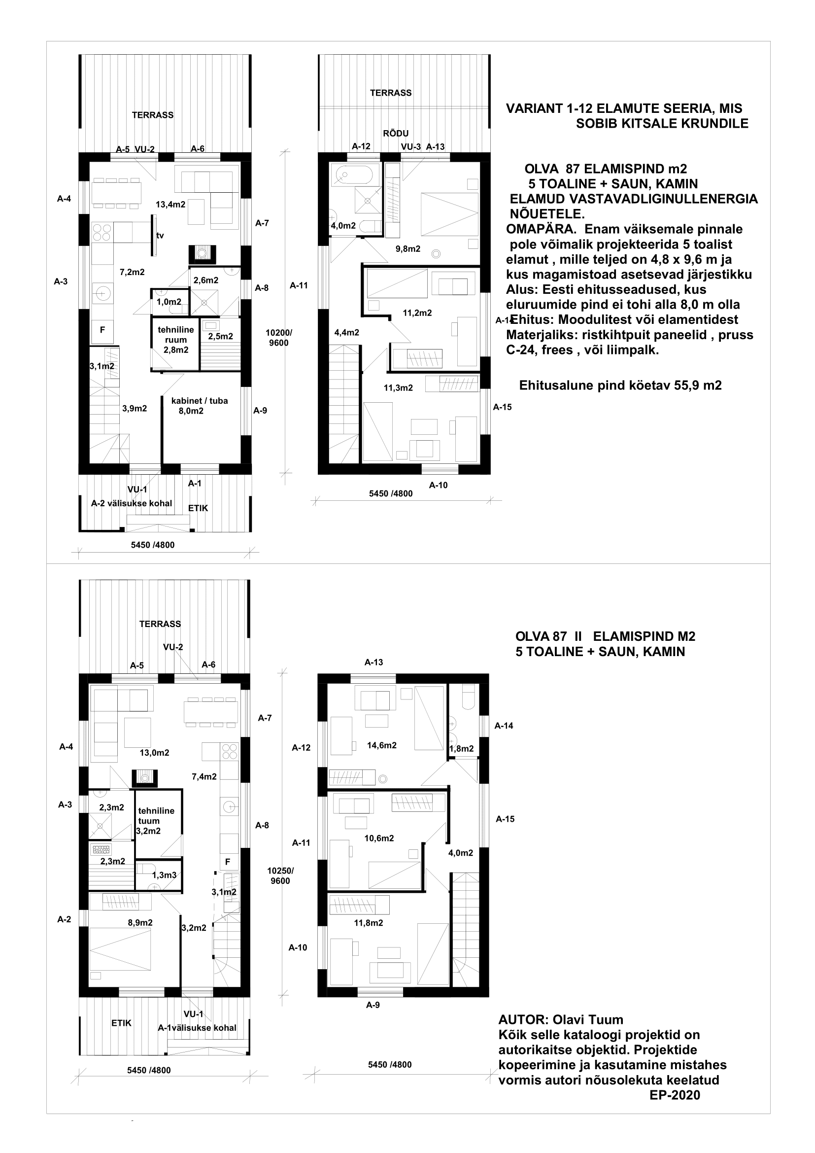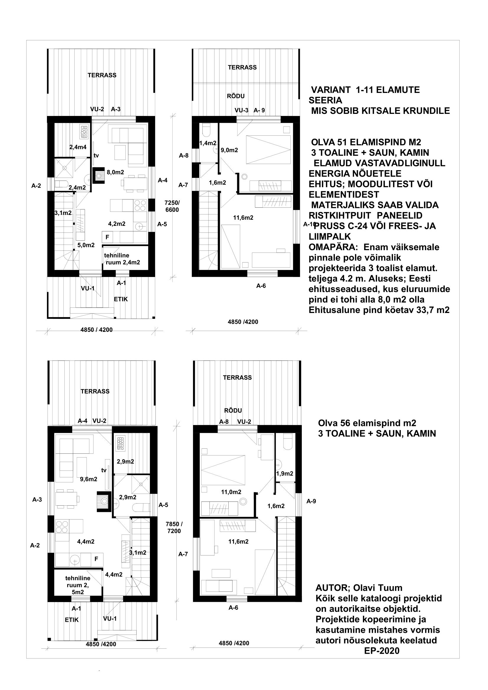 a) Projekteeritud kõige väiksema ehitusaluse pinnale risküliku kujulised kahe kordsed elamud, kus 2,3,4 magamistuba asetsevad järjestikku, nii vertikaalses kui horisontaalsel kujul. Selle väite aluseks on Eesti ehitusseadused, kus eluruumide pind ei tohi alla 8,0m2 olla ja laius alla 2,4 m.