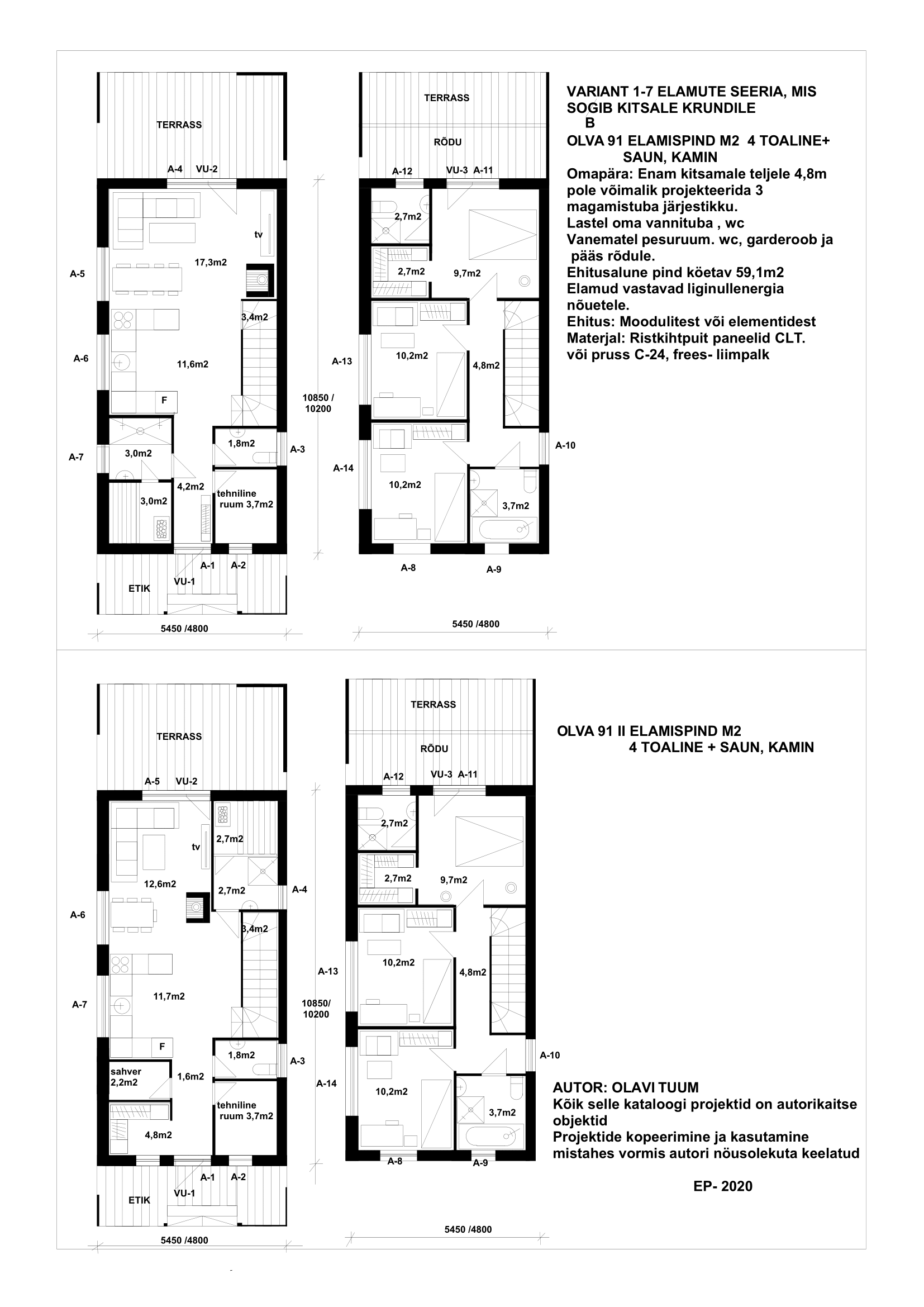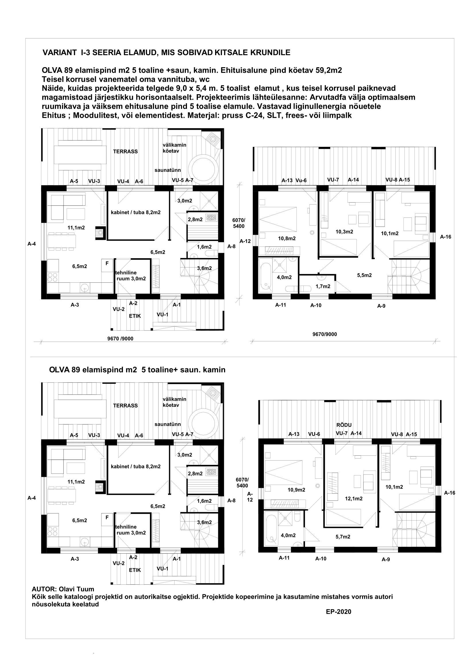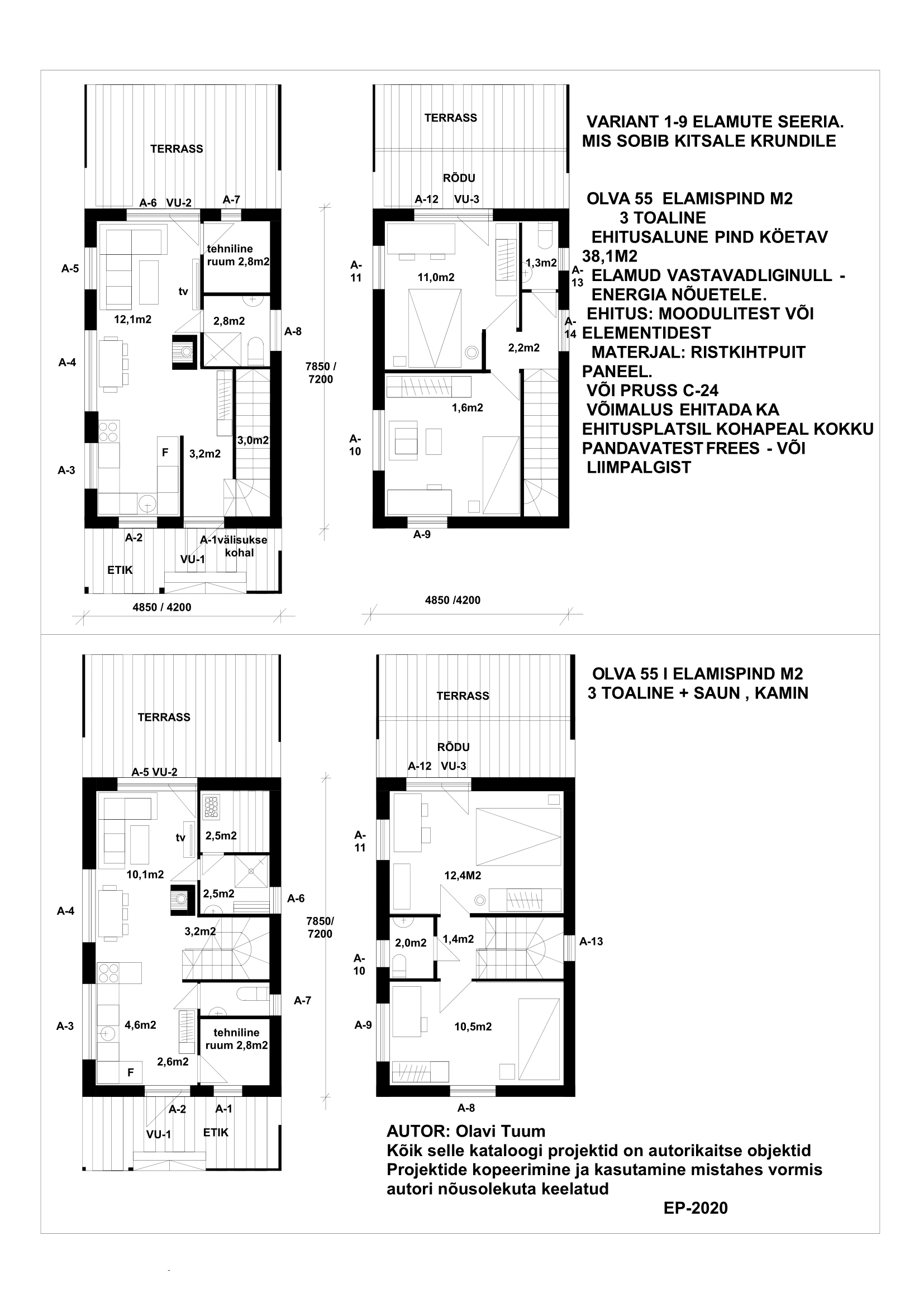 a) Projekteeritud kõige väiksema ehitusaluse pinnale risküliku kujulised kahe kordsed elamud, kus 2,3,4 magamistuba asetsevad järjestikku, nii vertikaalses kui horisontaalsel kujul. Selle väite aluseks on Eesti ehitusseadused, kus eluruumide pind ei tohi alla 8,0m2 olla ja laius alla 2,4 m.